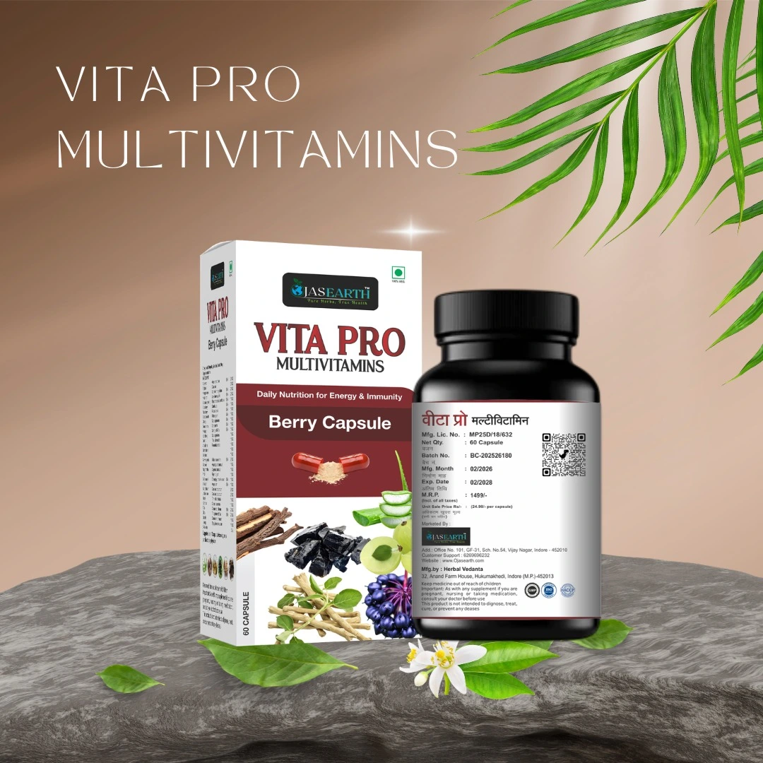 Ojas Earth Vita Pro Multivitamins Berry Capsule is a powerful Ayurvedic daily multivitamin supplement enriched with over 30 natural herbs, berries, and plant-based extracts — all in one 500mg capsule. Marketed by the trusted brand Ojas Earth (Pure Health, True Health), this unique berry-based herbal multivitamin is specially designed to provide daily nutrition for energy and immunity for both men and women.